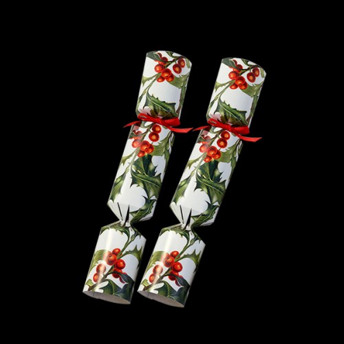 Our Christmas crackers feature a traditional holly design on a white background with one already tied ribbon and one loose ribbon to be tied once filled.