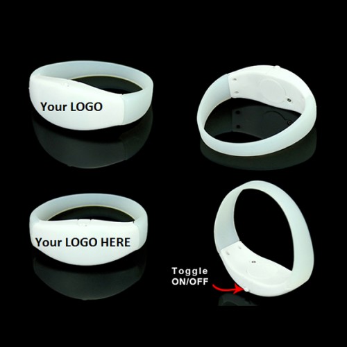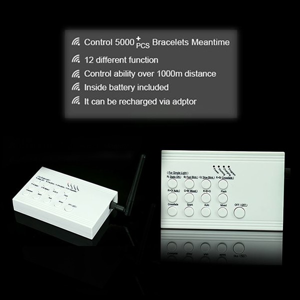 Set of 250 Remote Control LED Bracelets. The bracelet is a white/transparent silicon material and each bracelet has an ON/OFF switch. This disposable product has a battery life of approx. 6 hours and can be used both indoors and outdoors with a distance of approx. 2,500 - 3,000 feet from the control.