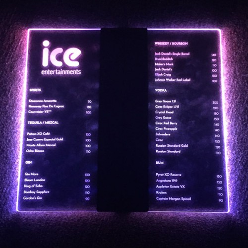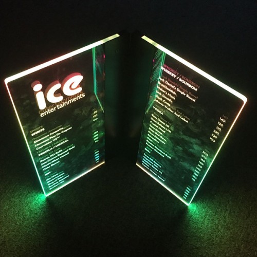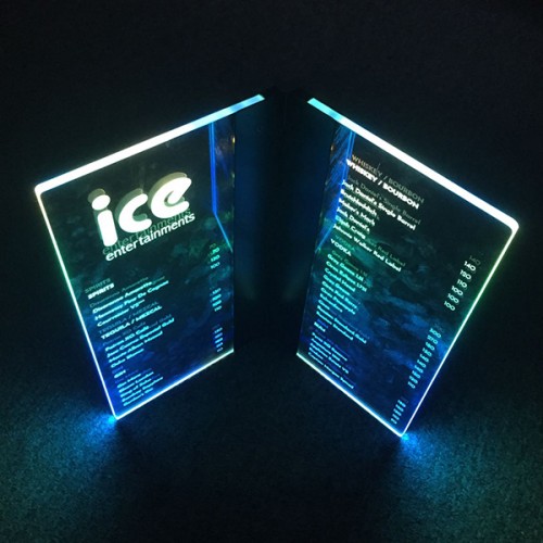 We have worked with a number of high profile venues and drinks brands to develop bespoke versions of this product. The bespoke colour changing VIP LED 'Twilight Menu' can be customised and modified to feature your feature your company’s logo and pricing. Please email sales@iceentertainments.com or call our sales team on +44 (0) 207 298 5572 to discuss your requirements.